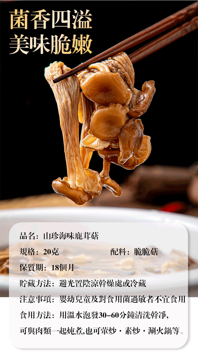 20分鐘前 【煲湯炒菜下飯必備】山珍海味鹿茸菇 - 8入組-NT$1098